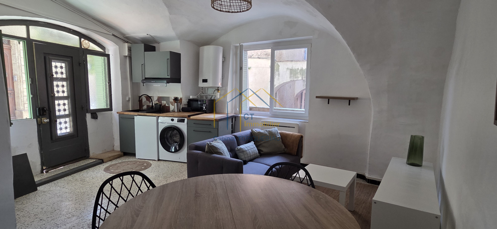 ANIANE, en plein coeur du village et à proximité de toutes les commodités, T2 joliment meublé de 39 m2 situé au rez-de-chaussée d'un petit ensemble immobilier. Il se compose d'une pièce principale voutée avec coin cuisine, d'une chambre, d'une salle d'eau et d'un wc.