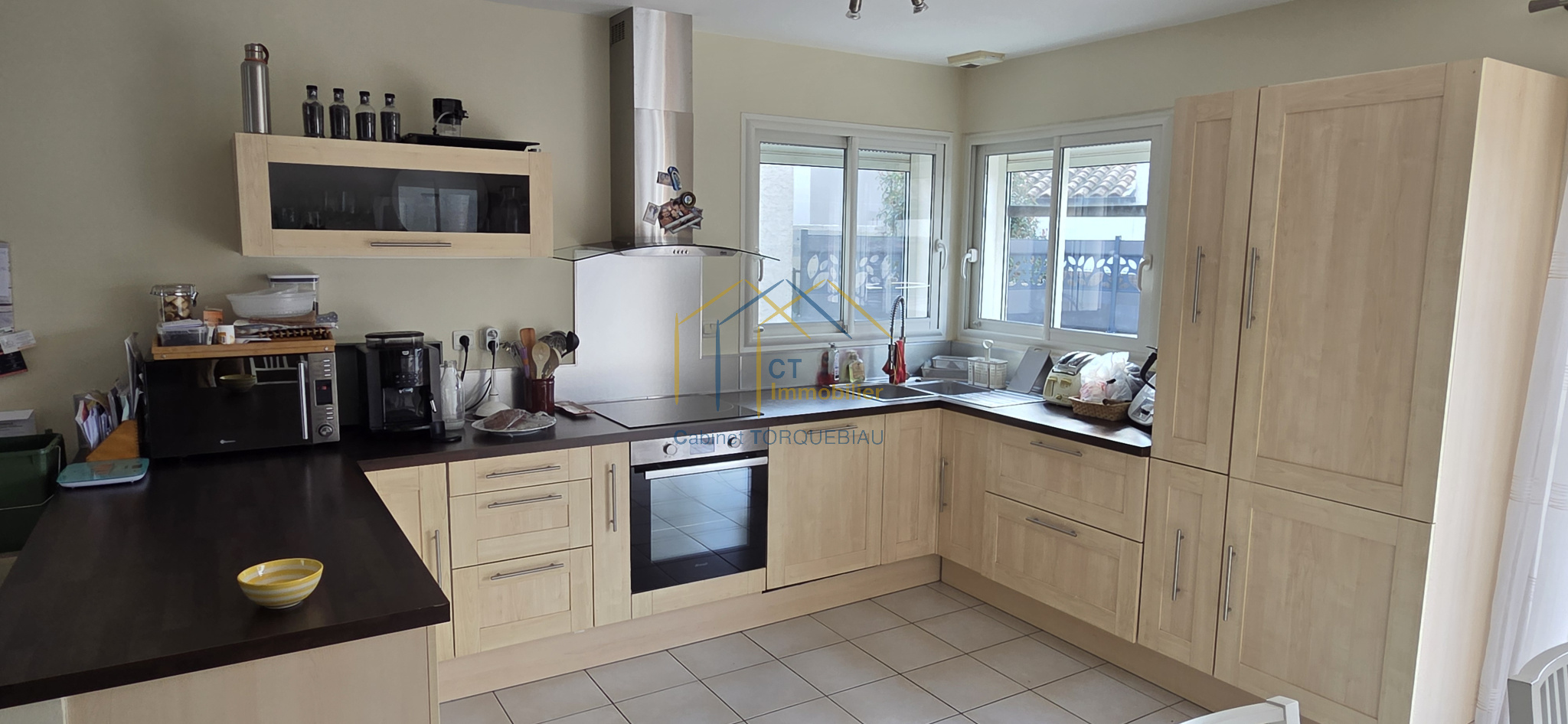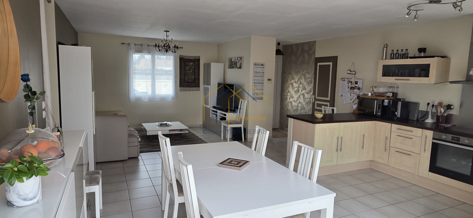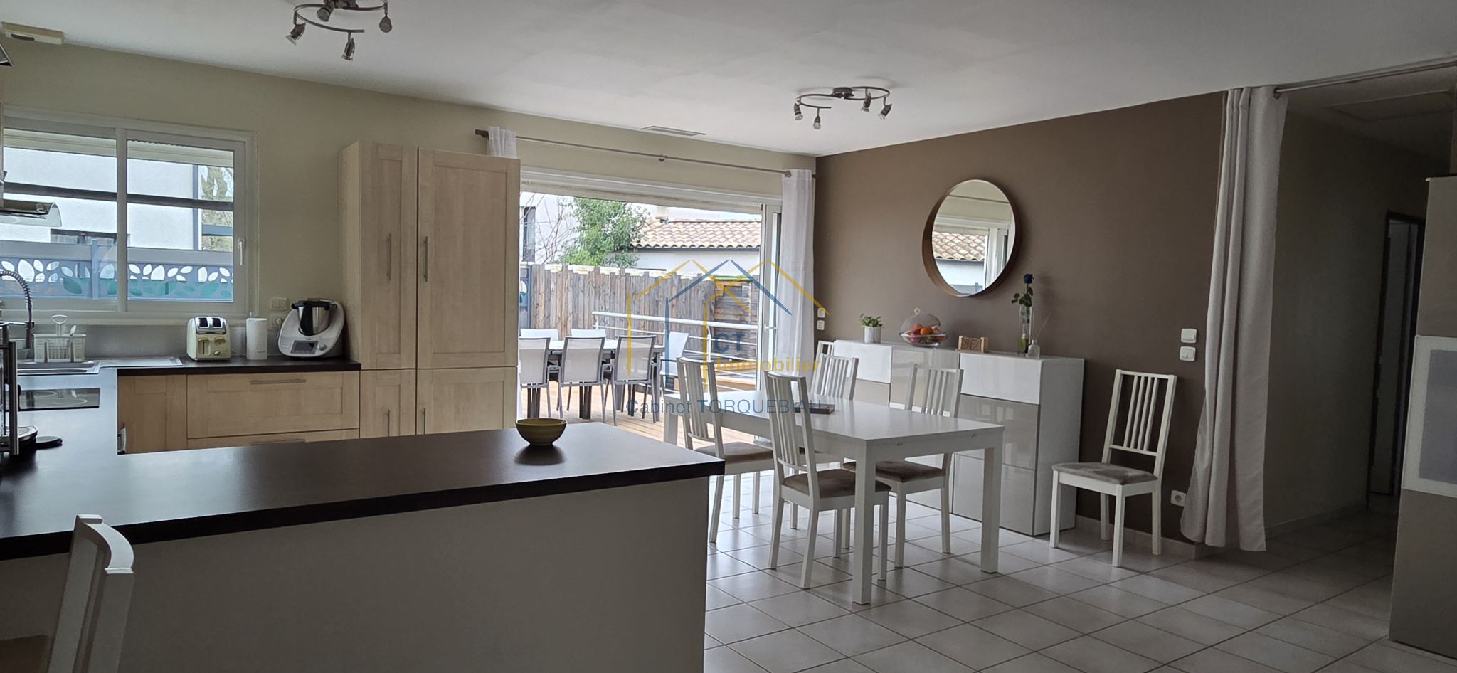 La maison se composant: D'une grande pièce principale avec cuisine équipée de 40m² avec une grande baie vitrée à galadage donnant sur la terrasse, trois chambres de 10 à 13m², une pièce d'appoint dans le garage faisant office de bureau et buanderie, une grande salle d'eau avec douche à l'italienne et un wc